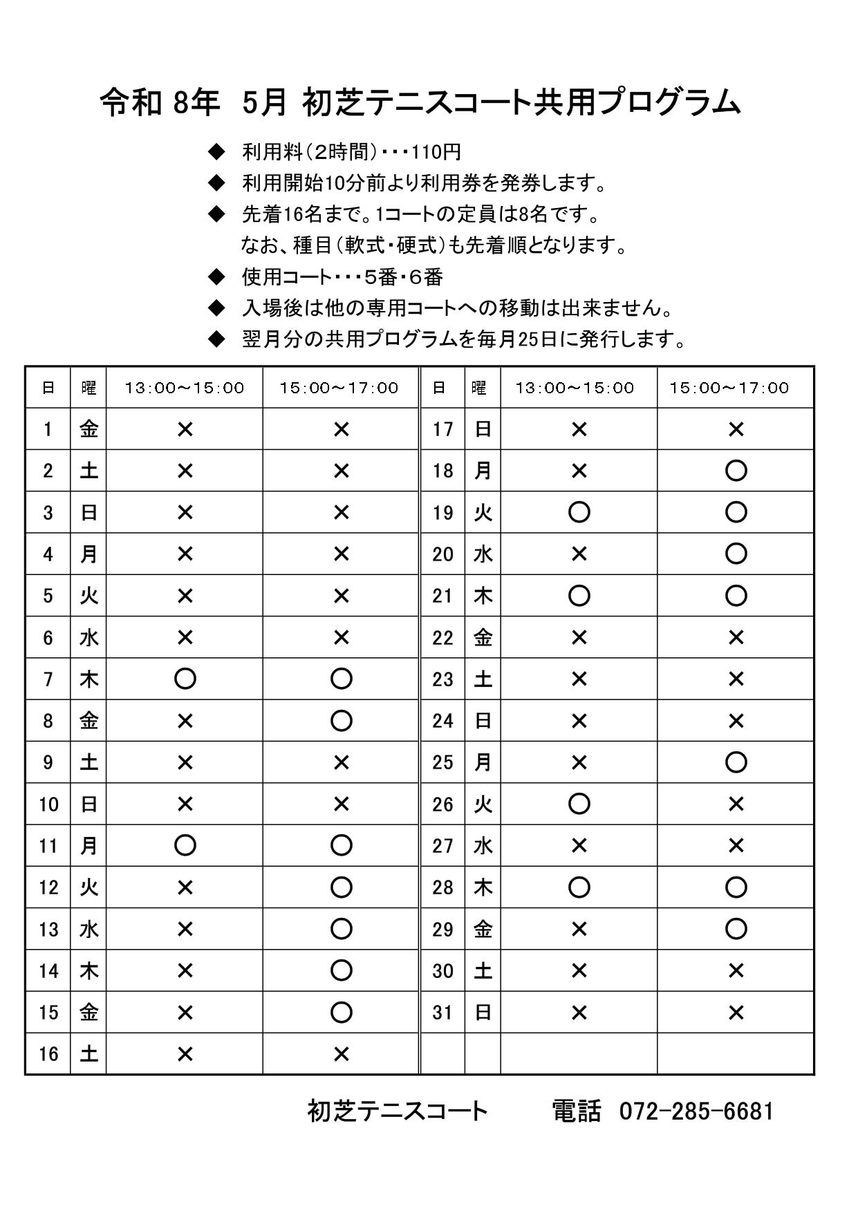 2026年5月初芝テニスコート・共用プログラム